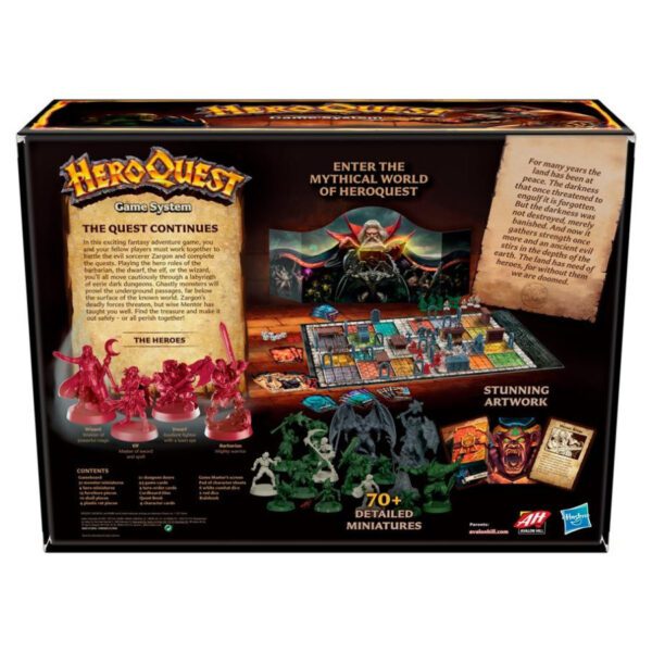 In the HeroQuest dungeon crawl board game, heroes work together to complete epic quests, find treasures and defeat the forces of evil. This semi-cooperative board game has one player taking on the role of Zargon, the Game Master, while 4 mythical heroes–Barbarian, Dwarf, Elf, and Wizard–team up in their quest for adventure in a maze of monsters and eerie dark dungeons. Players can immerse themselves in the fantasy with the stunning artwork, and 65+ detailed miniatures. The game comes with 14 quests, and has limitless replayability because players can also build their own quests and create their own stories. Gather friends together for an exciting night of tabletop gameplay in an epic battle of good and evil.